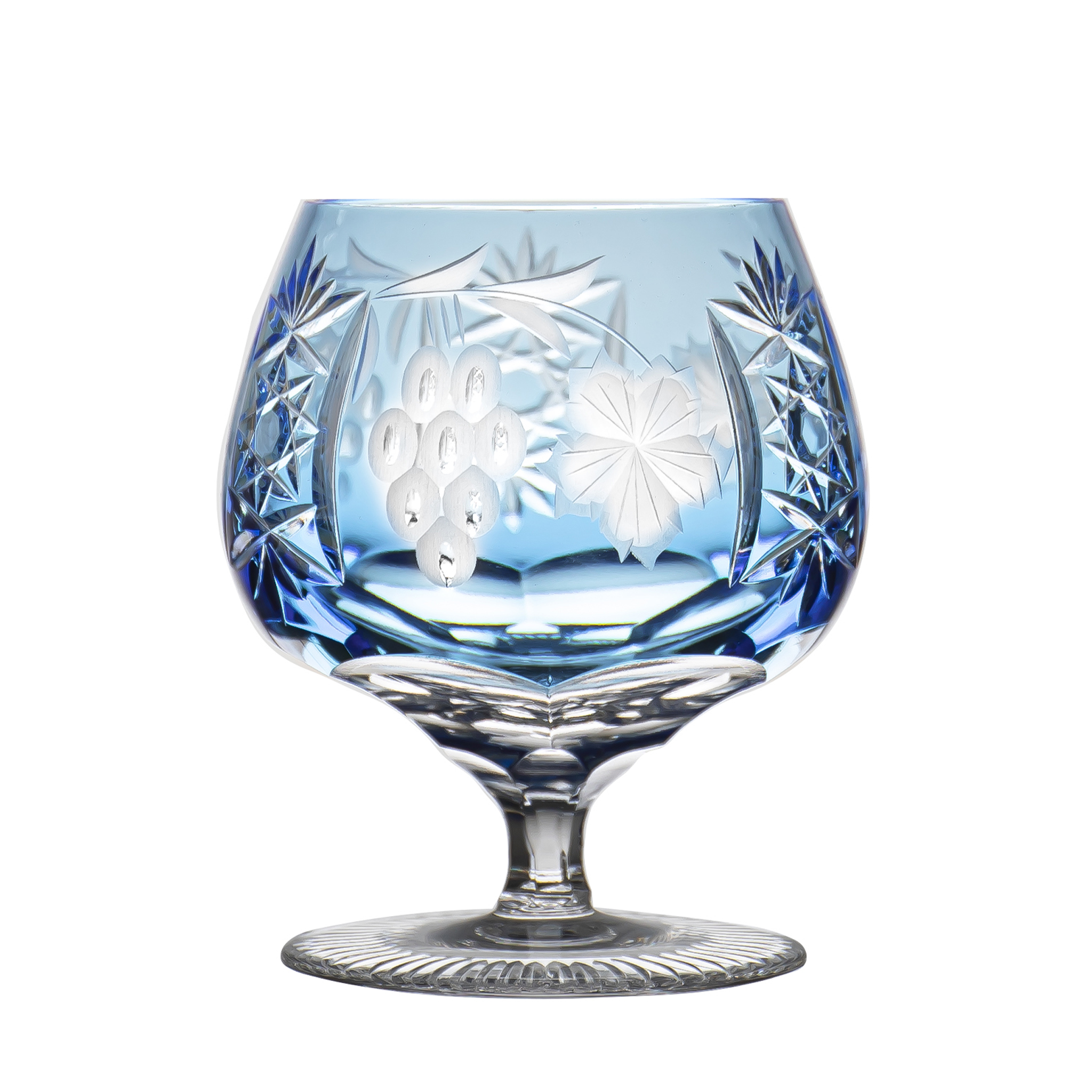 Probieren Sie Ihr Lieblingsgetränk aus der weltberühmten Ajka Crystal Kollektion namens Marsala. Sie können sich immer Eleganz und Luxus mit diesem sehr seltenen, gefärbten Bleikristall leisten, der mundgeblasen und handgefertigt ist. Brandyglas verziert mit wunderbaren Trauben und Blättern in sehr seltener hellblauer Farbe.